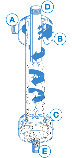 The cyclonic separators are not actually a filter since there is no screen element inside to filter out the particles. The separation is instead ensured by means of centrifugal force, and the separator’s efficiency is directly proportional to the specific density and size distribution of the particles. The centrifugal separator eliminates 98% of all particles with a specific gravity of 2.6-2.8 (such as sand) down to a size of 75 microns, provided that the pressure loss over the unit is minimum 0.3 bar.