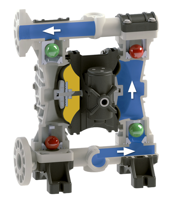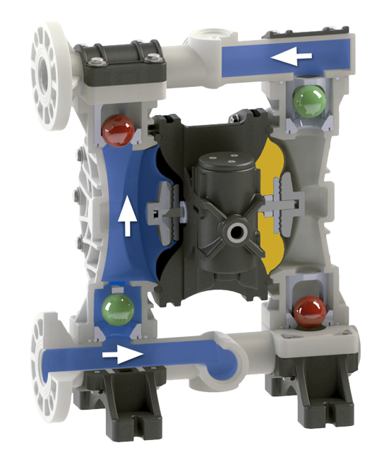 Compressed air fills the right internal chamber, thanks to the movement of the opposite diaphragm it creates, by lifting the ball of the lower valve, the suction of the incoming liquid. At the same time, the left chamber is in the "discharge" cycle